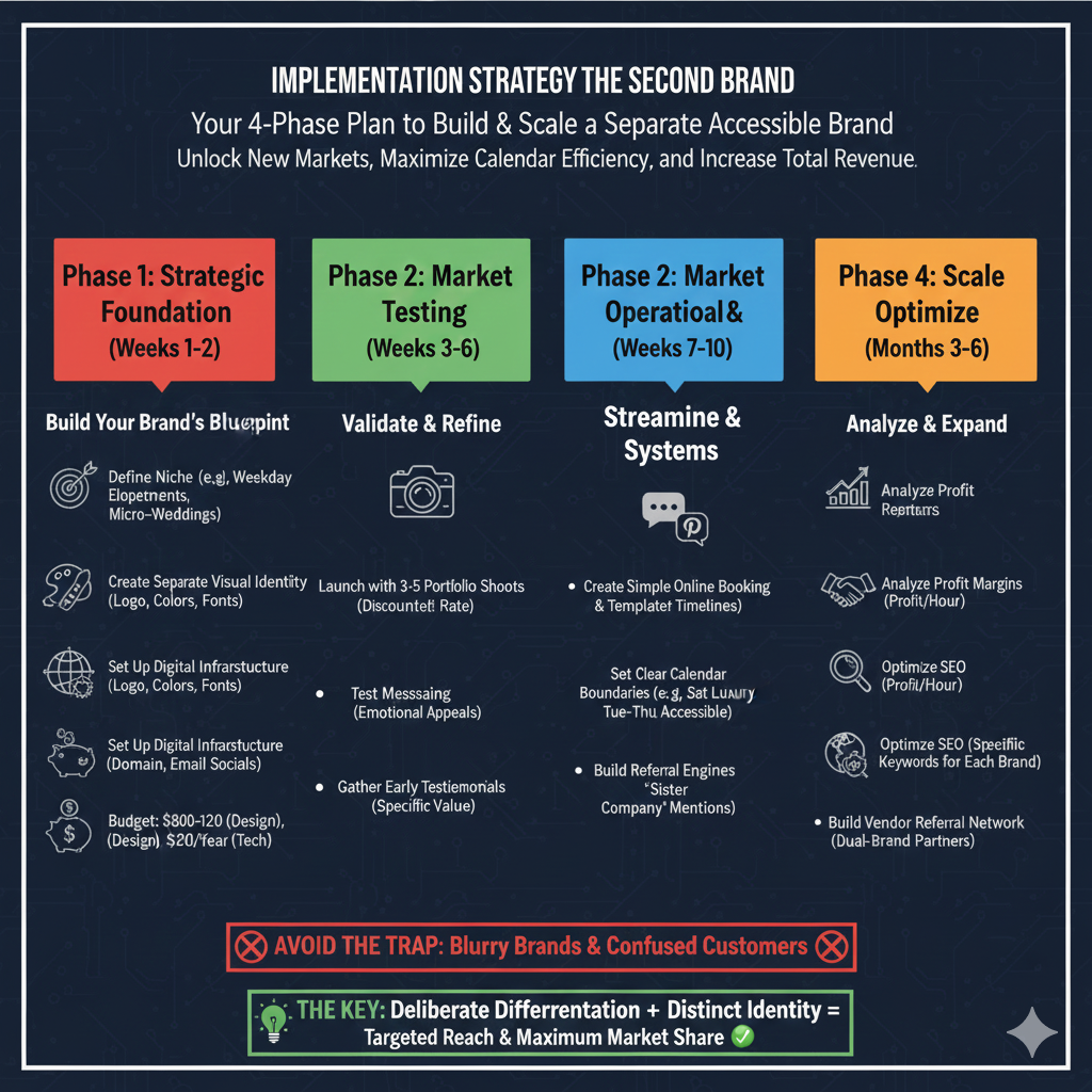 Sarah, a wedding photographer in Austin, solved this by launching two completely separate brands. Her luxury brand “Sarah Rose Photography” charges $4,500 for Saturday weddings. Her accessible brand “Wildflower Elopements” targets intimate weekday ceremonies at $750-900. Same photographer, different markets. Within six months, revenue increased 60% without adding Saturday bookings.
