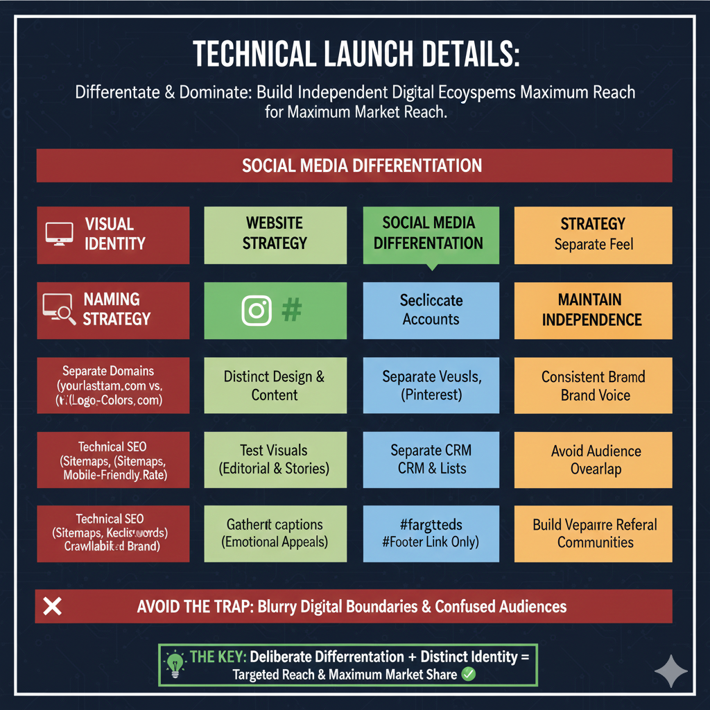 Set up a completely separate digital infrastructure: unique domain, hosting, email address, social media handles, and Google Business listing. This costs under $200 annually but creates legitimate market separation.
